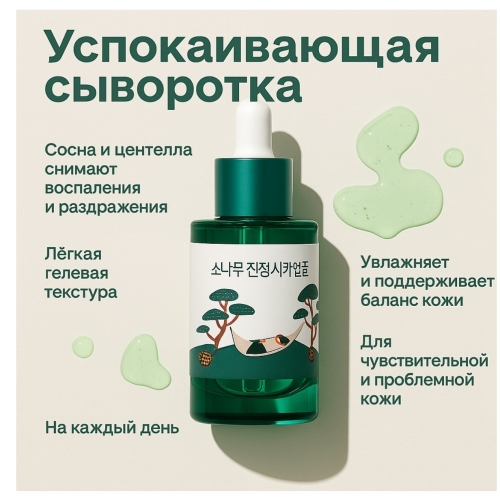 №2324 Сыворотка Сосна Round Lab (Оригинал) Ампула с экстрактами сосны и центеллы для проблемной кожи Round Lab Pine Calming Cica Ampoule успокаивает, смягчает и увлажняет, улучшает состояние кожи при воспалениях, акне и розацеа. Средство укрепляет естественный защитный барьер и препятствует повреждению, вызванному ультрафиолетом, сухим ветром, перепадом температур и другими факторами, которые приводят к раздражению и обезвоженности. Содержит 80,4% комплекса Pine Cica Activer, состоящего из экстракта сосны, центеллы и гликопротеинов, а также 3 вида гиалуроновой кислоты и LHA-кислоту.
