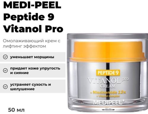 №5199 Крем MEDI PEEL Peptide 9 Vitanol PRO Cream (Оригинал) Лифтинг-крем с пептидами и 12% ниацинамида для ровного тона MEDIPEEL Peptide 9 Vitanol PRO Cream обеспечивает одновременно антивозрастное и осветляющее действие, сокращает выраженность морщин и пигментных пятен, придаёт упругость и здоровое сияние. Разглаживает, повышает эластичность и плотность, помогает в борьбе с мелазмой, следами постакне и фотостарением, препятствует появлению новой пигментации. Обеспечивает укрепляющее действие и мощную антиоксидантную защиту, замедляя процесс старения. Содержит 9 пептидов, 12% ниацинамида, витаминный комплекс Vitanol, глутатион, коллаген, масла кокоса и жожоба, растительные экстракты, ферменты протеобактерий Alteromonas, BHA и эктоин.