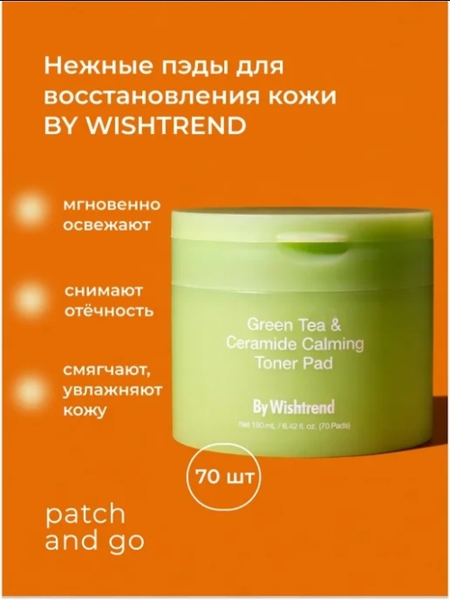№3115 Тонер Пэды BY WiISHTREND Green Tea & Ceramide Calming (Оригинал) Тонер-пэды By Wishtrend Green Tea & Ceramide Calming Toner Pad уменьшают чувствительность, раздражение и покраснение, выравнивают текстуру и тон кожи. Нормализуют выработку себума, способствуют сужению пор.